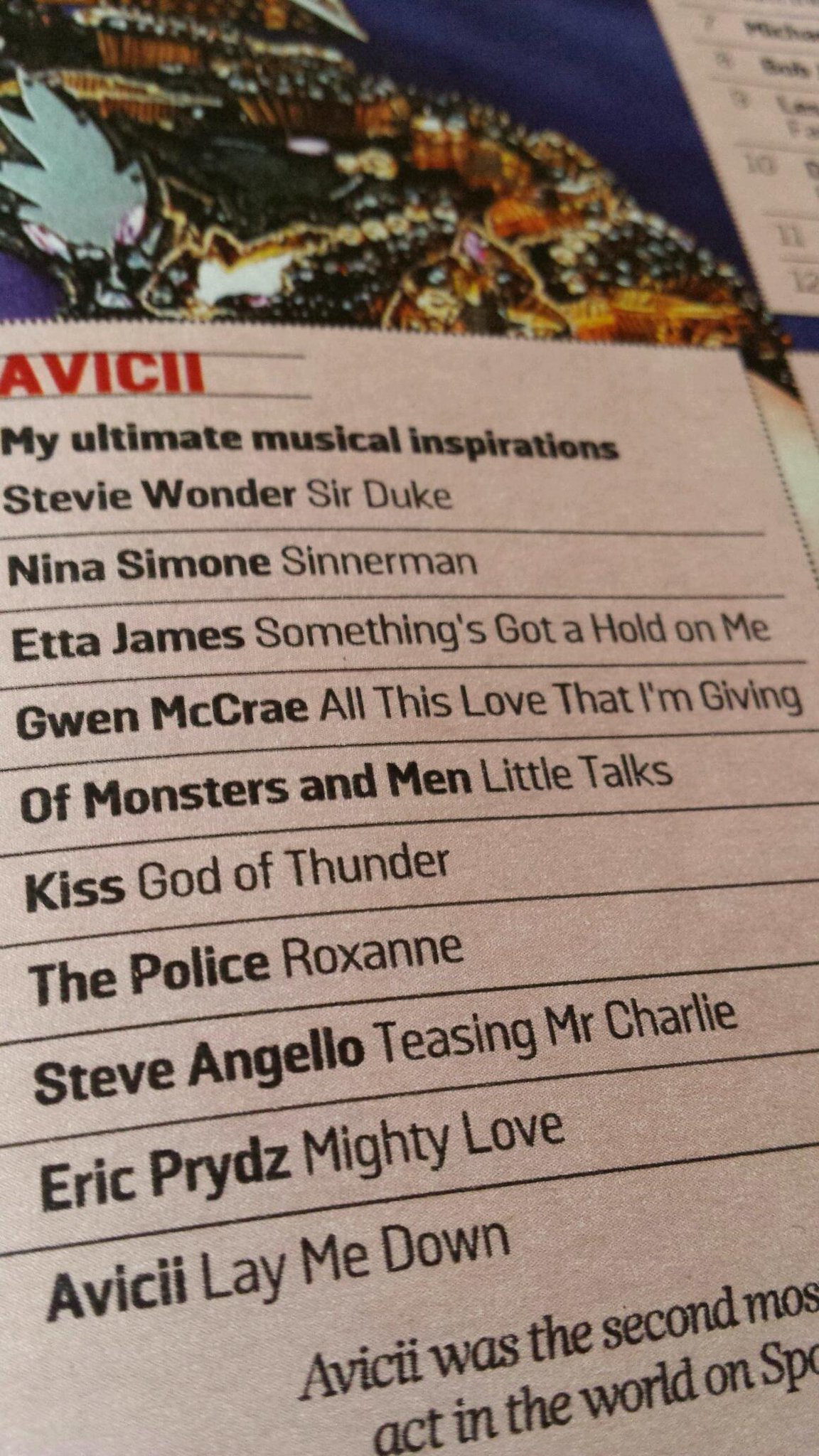 - Pic of Avicii's top 10 playlist from Sun Times Culture